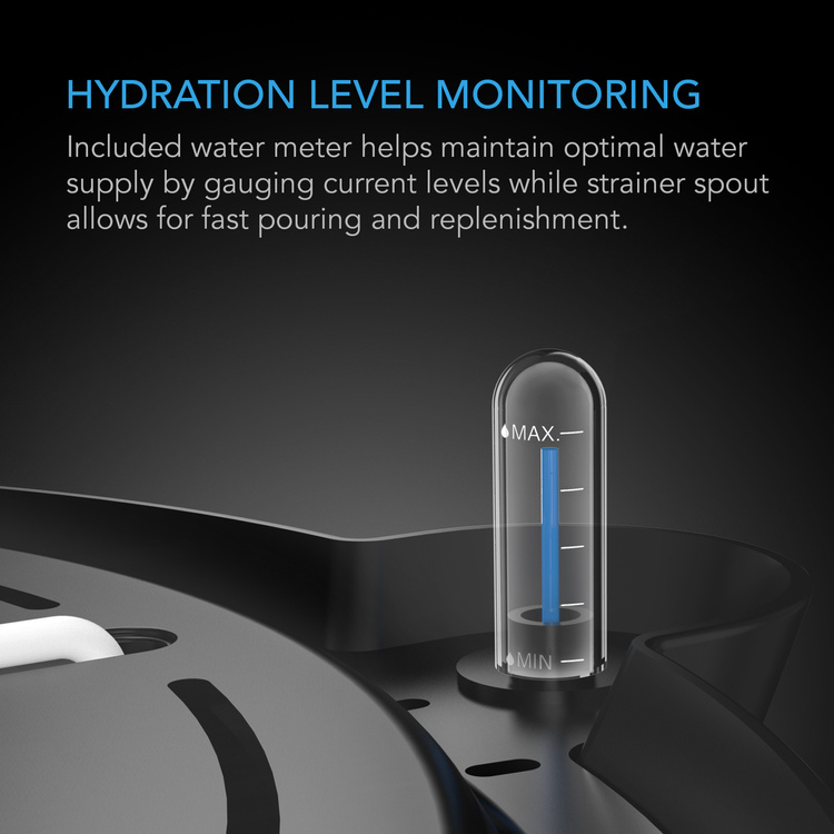 - Included gauge displays the current water level while the strainer spout enables quick replenishment.