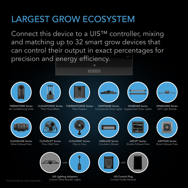 A modern environmental heater designed with smart controls that maintain optimal temperatures for successful plant cultivation. It provides your grow tent with greater stability throughout the year by maximizing climate control and minimizing plant stress caused by sudden temperature changes. Thanks to the extended sensor range and flexible hose, the device allows for continuous monitoring and regulation of the climate. Safety features include an automatic shut-off system that activates when the heater falls, tilts beyond a 15° angle, or overheats. The product is part of the UIS™ platform of grow devices and smart controllers, designed for integration with the AC Infinity app via Wi‑Fi to achieve ideal conditions in your environment.