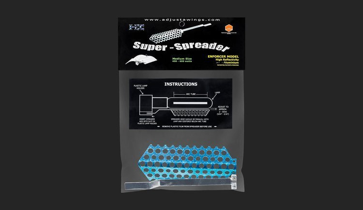 The Super-Spreader reduces harmful heat from HPS and MH lamps, allowing you to bring the light up to 44% closer to the plant and prevents even the slightest hot spot and makes the entire illuminated surface evenly. This type of spreader is applied to the E40 socket and locks the mounting screw An easy way to increase the performance of the reflector |