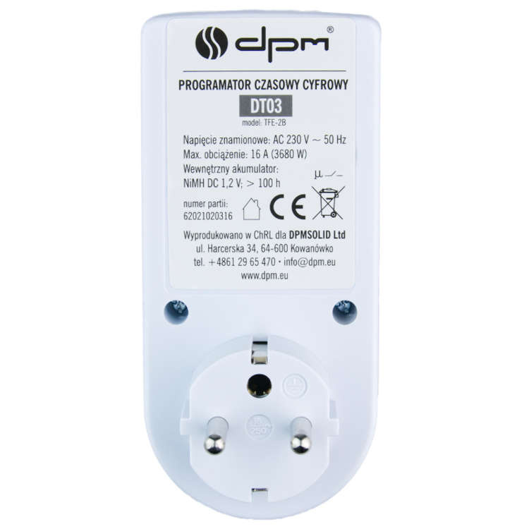 – 10 programs per day, on/off cycles – 16 combinations of days or day blocks to choose from – large LCD display for better visibility – manual setting – on / auto / manual shutdown – programming accuracy – 1 minute – 12/24 hour operation real-time display with second-time – minimum setting time: 1 minute – reset button – maximum load: 16A, 3600W – Voltage: 220-240VAC 50Hz – operating temperature -10°C ~ 40°C – soiling pin child protection – packed in blister – CE certificate – manual in English |