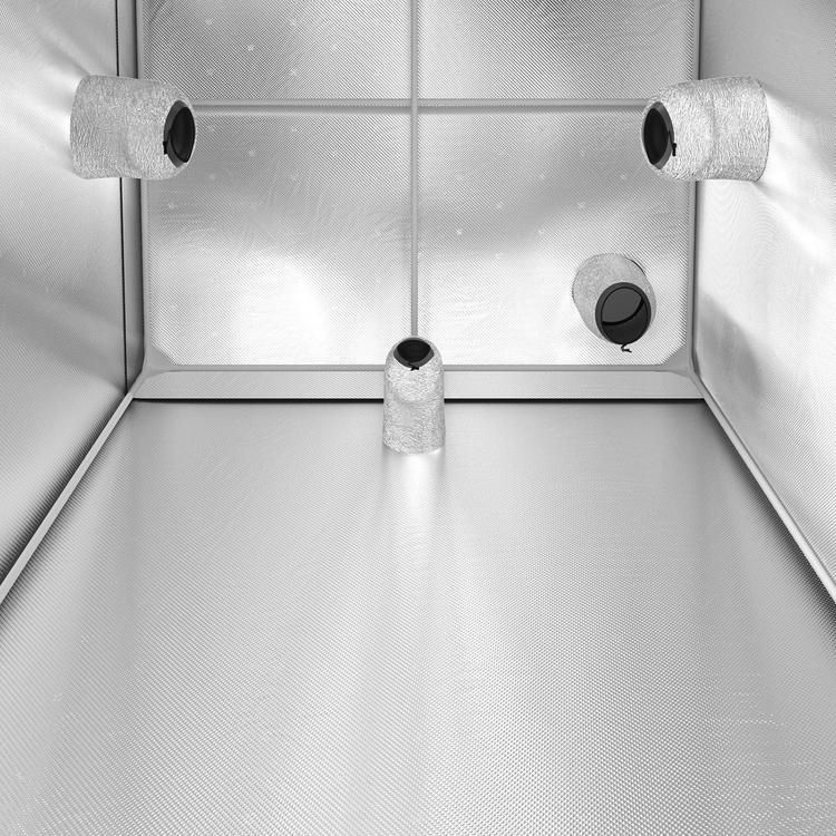 Galaxyfarm grow tents feature a sturdy metal frame with 16mm diameter tubes and durable plastic connectors. Each model includes an additional removable floor, making it easier to keep the grow area clean. The interior is lined with MYLAR Diamond 210D, a highly reflective material with a diamond structure, capable of reflecting up to 95% of light, ensuring optimal illumination for plants. The dark gray exterior gives the tent a sleek and professional look.