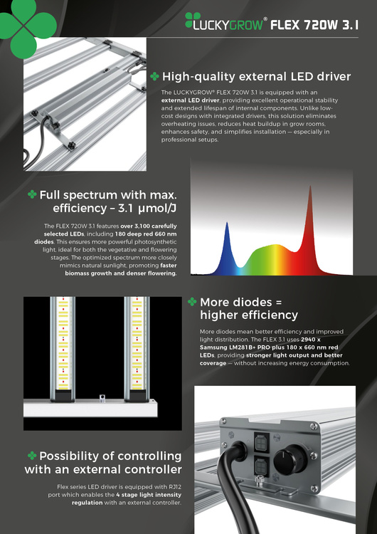 The LUCKYGROW FLEX 720W 3.1 LED grow lamp is an advanced LED device designed specifically for plant cultivation. Thanks to the use of modern technology and an optimized spectrum of photosynthetically active light (PAR), the device guarantees efficiency and effectiveness in every phase of plant growth.