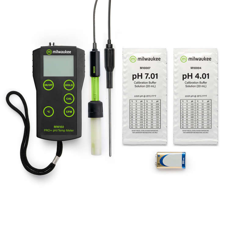The Milwaukee MW102 PRO + pH meter has won fans around the world for its reliable, fast and simple operation and durability. Accuracy up to ± 0.02 pH with automatic temperature compensation.
