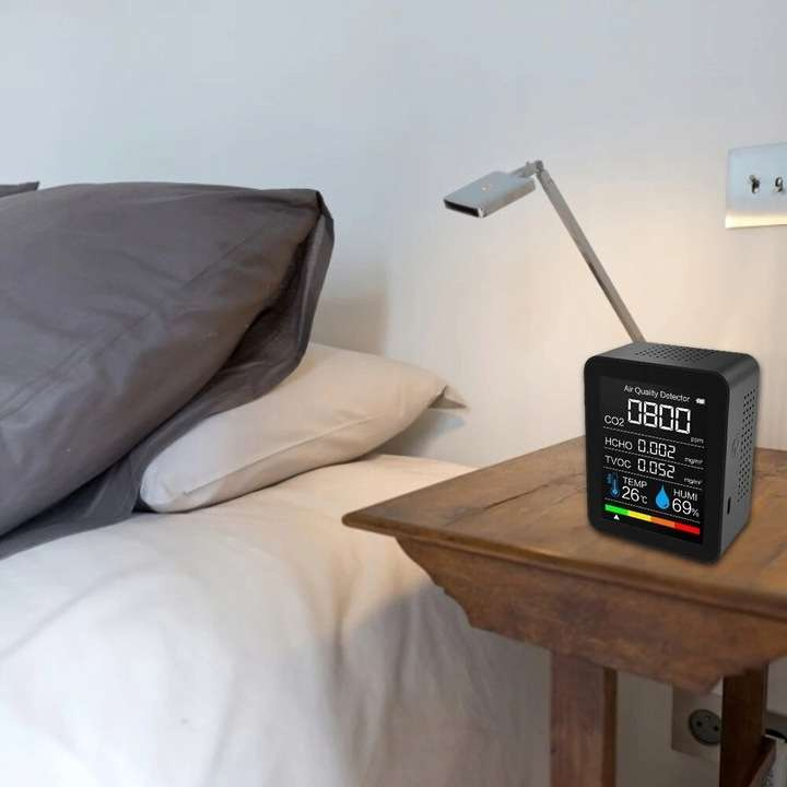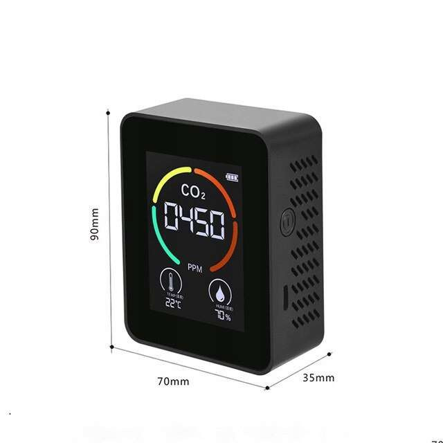 Air quality tester, can be used for real-time testing of CO2 concentration, TVOC value, HCHO value , temperature and humidity. Equipped with a large digital LED display with backlight, you can clearly see the remaining electric amount and CO2 concentration. The color bar changes depending on the CO2 content. Compact and portable, it can be placed in a grow room or any room in the home. The detector guarantees a reliable and precise measurement of the air quality in the environment.
