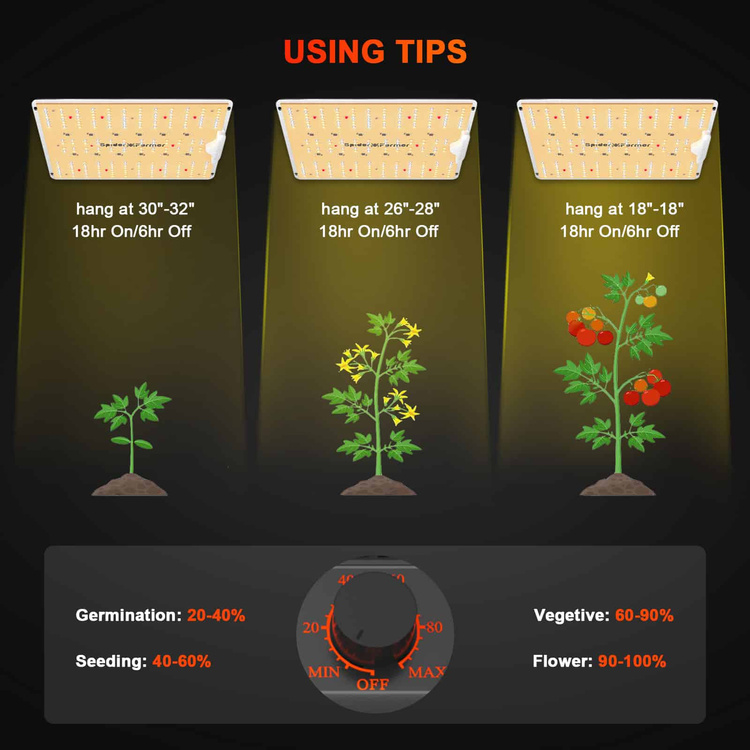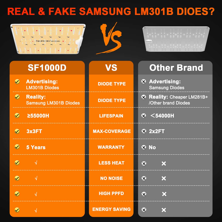 The SPIDER FARMER LED Grow Lights feature cutting-edge, energy-efficient LED technology utilizing SAMSUNG LM301B diodes. These LEDs boast an impressive efficiency of 2.5umol/J, ensuring deeper light penetration for your indoor garden. The SF1000-D model is remarkably energy-efficient, consuming just 100W—50% less than traditional HPS or CMH lamps—while delivering yields up to 50% higher. It provides optimal illumination for both the vegetative stage over an area of 90x90cm and the flowering stage over 60x60cm.