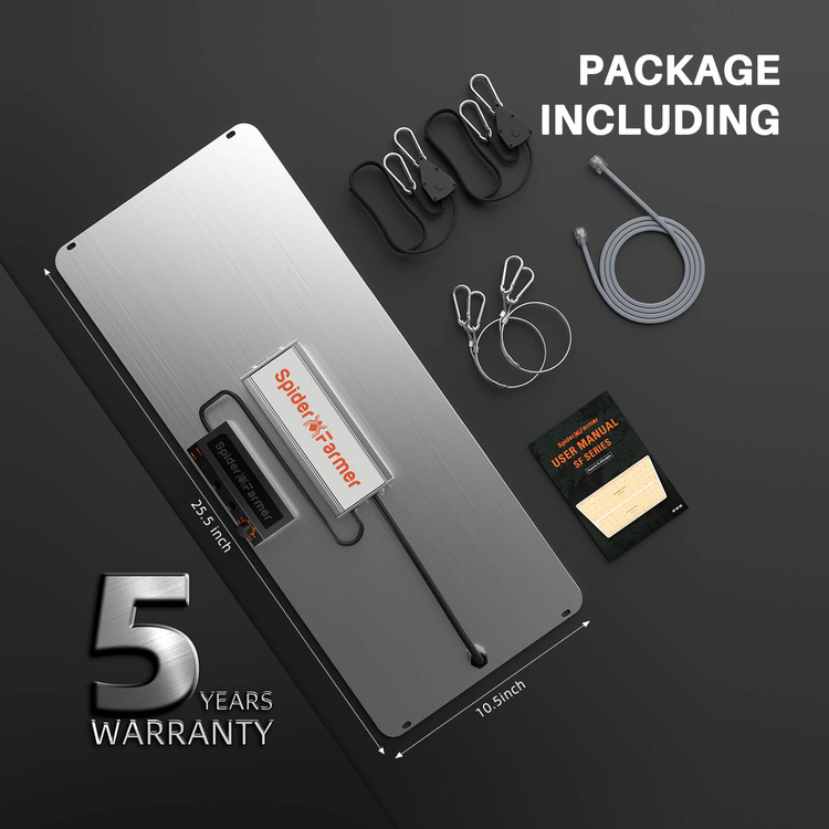 With over 10 years of experience in manufacturing LED grow lights, SPIDER FARMER is committed to creating more efficient, suitable, and high-quality home planting equipment for plant growth and strives to become a trusted partner for every grower. The package includes a Spider Farmer SF2000 grow light, instruction manual, a pair of silver hooks, and a pair of black hangers.