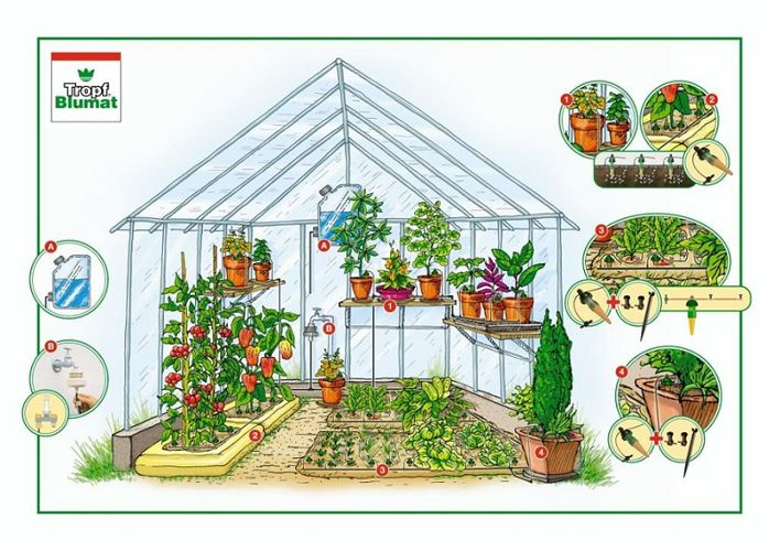Set for irrigation of plants in the open air or in the greenhouse Blumat 50. It can also be used to irrigate larger collections of garden vats, flower beds or winter gardens. Expandable up to 500 drips.